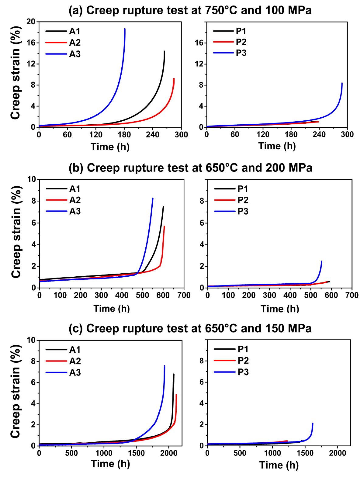 그림 6은 A1~A3 시편과 P1~P3 시편의 크리프 파단 곡선으로 (a)는 750 °C에서 100 MPa을 (b)는 650 °C에서 200 MPa을 (c)는