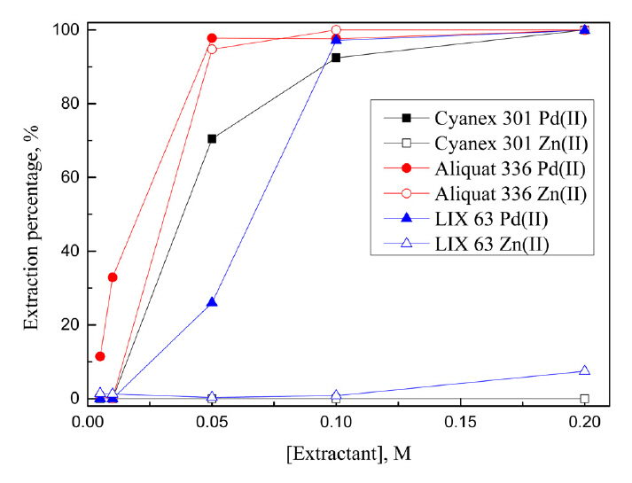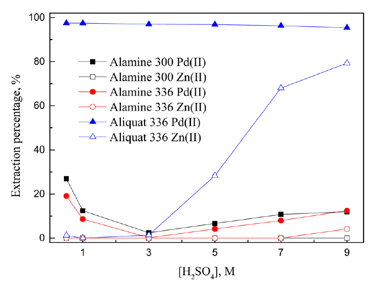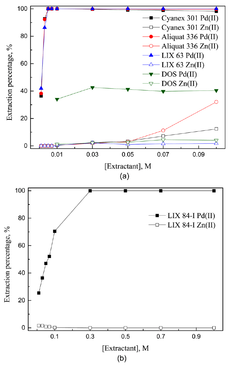 황산용액에서 용매추출에 의한 팔라듐과 아연의 추출 거동을 조사하기 위해 황산팔라듐(PdSO4, Aldrich, 98%)과 황산아연수화물(ZnSO4·7H2O, Duksan Pure Chemical Co., LTD., 99%)을 증류수에 용해시켜 두 금속이 혼합된 용액을 준비했다. 금속의 농도는 팔라듐