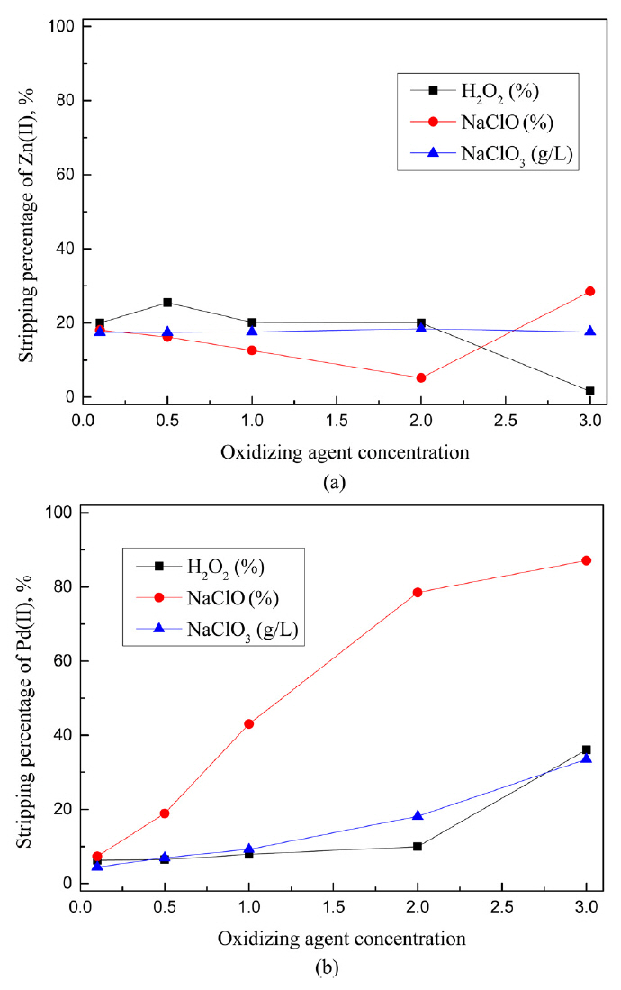 아연(II)의 농도는 각각 0.1과 0.5 g/L로 고정했으며 황산과 추출제 농도를 변화시켜 금속의 추출거동에 미치는 영향을 조사했다. 한편 도금폐액에서