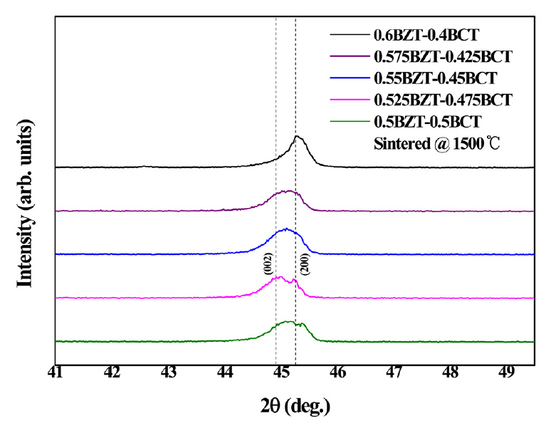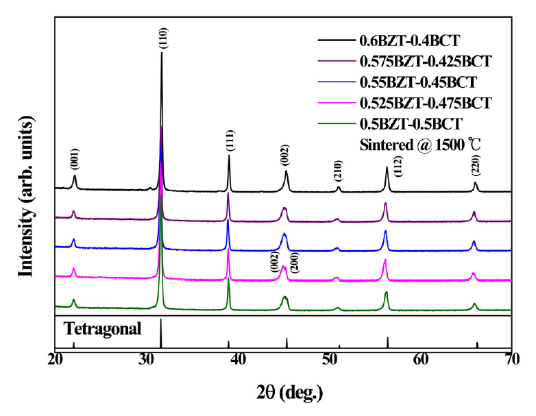 Figure 4 shows the X-ray diffraction θ-2θ patterns of the (1-x)BZT–xBCT ceramics sintered
