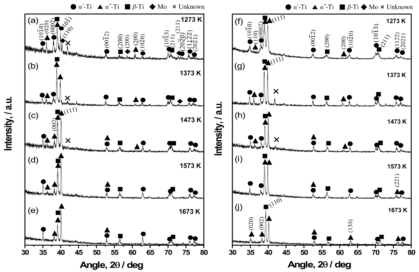 predominant phases at 1273 K were α''-Ti and α''+β Ti with sub α'-Ti peaks in Fig 4(f), although the α''+β Ti phase was close to β-Ti as the sintering temperature increased.