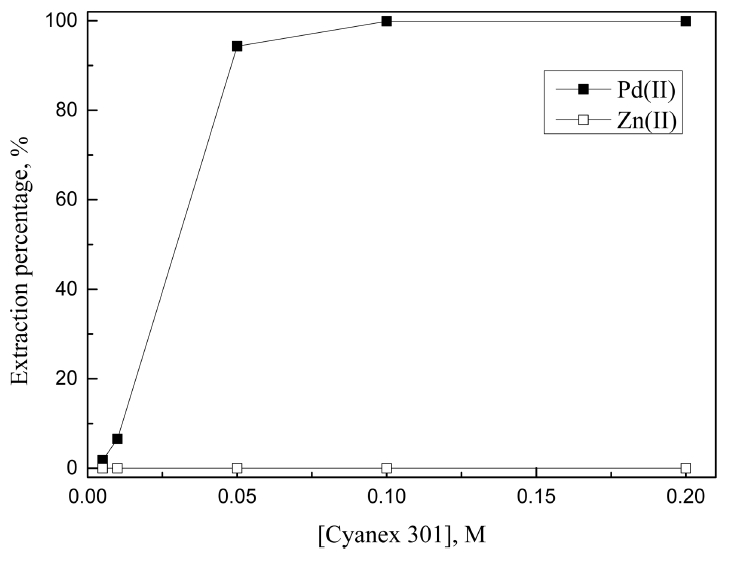 from 7 M hydrochloric acid leaching solution of cemented Pd. (Aqueous: [Pd2+] = 1.926 g/L, [Zn2+] = 0.074 g/L, [HCl] = 7 M; Organic: [Cyanex 301] = 0.005-0.2 M, A/O=1, Diluent: kerosene)