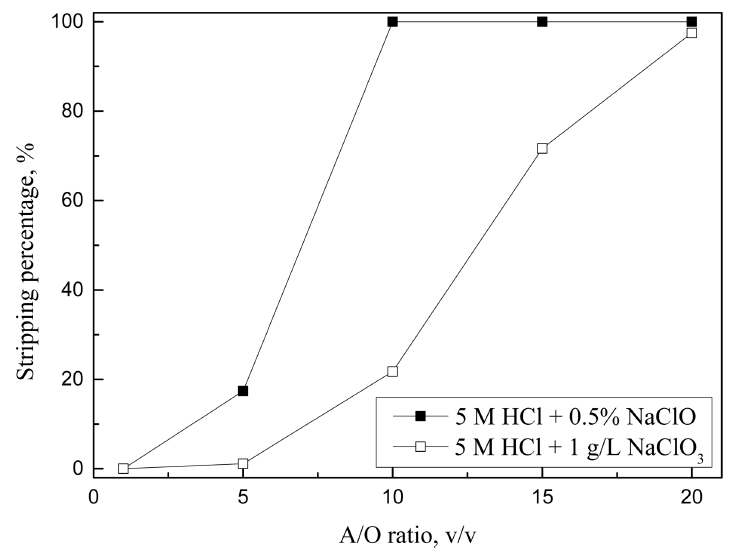 (Loaded Cyanex 301: [Pd2+] = 0.1 g/L; Aqueous: [HCl] = 5 M, [NaClO] = 0.1-2 % and [NaClO3] = 0.1-2 g/L, A/O=1)