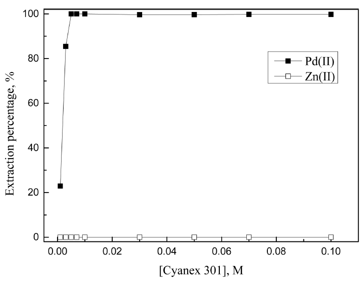 Effect of Cyanex 301concentration on the extraction percentage of Pd(II) and Zn(II)