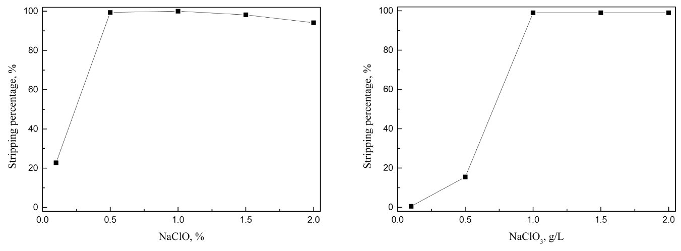 Effect of the concentration of oxidizing agent on the stripping percentage of Pd(II)
