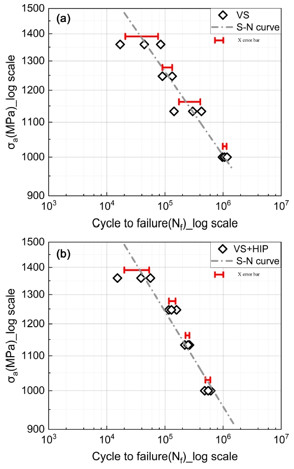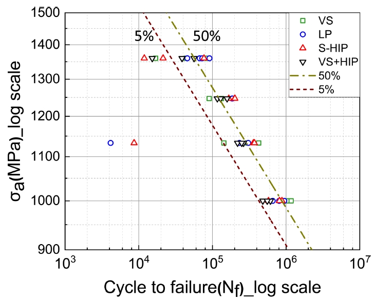 있다. 또한 전체적으로 VS+HIP의 평균 피로 수명은 VS 보다 낮았지만, 피로 수명의 산포가 VS와 비교했을 때 상대적으로 감소하였다. 즉, 추가적인