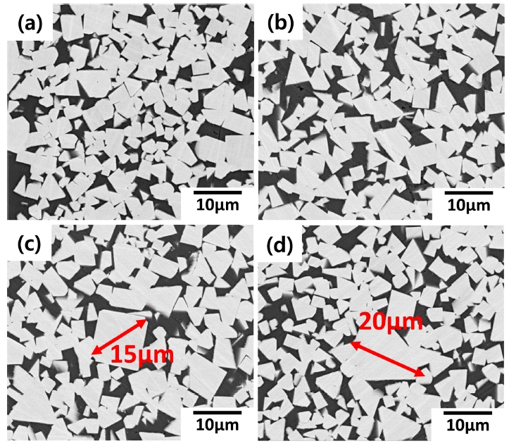온도 구간을 공정 온도 이상에서 진행하였지만, 추가적인 상의 검출은 없었다 [24]. 즉, 탄소 결핍 분위기에서 생길 수 있는 W, Co와 C의 3원 탄화물인 η-상이나 탄소 과잉으로 형성되는 흑연상의 출현은 없는 것으로 나타났다.