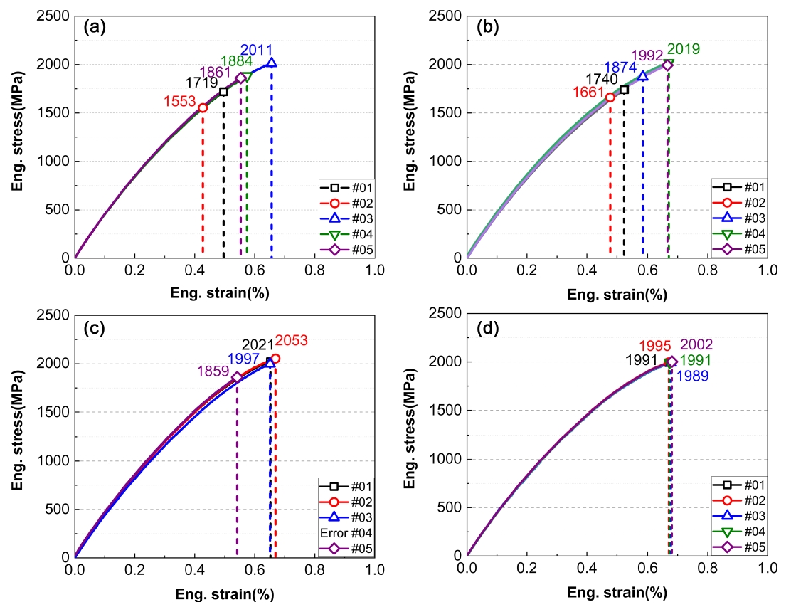 인장 파괴 강도 및 연신율은 매우 균일하고 최대값에 도달하고 있음을 알 수 있다. 또한 파면에서는 파단 기점으로 판단될 만한 기공과 같은 결함은 관찰되지