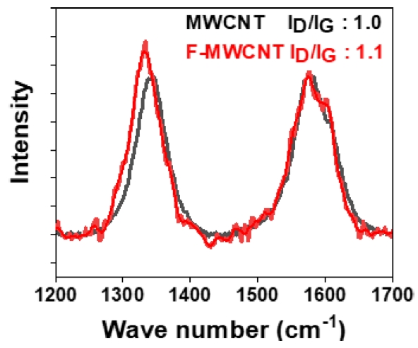 대한 결함의 영향을 적게 받는다. 이를 이용하여 ID/IG 값의 증가는 더 높은 결함 농도 또는 더 높은 정도의 결함을 나타낸다 [23]. 그림 3의 MWCNT(검은선)의 ID/IG 값은 1.0, F-MWCNT(빨간선)의 ID/IG 값은 1.1이다. F-MWCNT의 ID/IG값이 MWCNT의