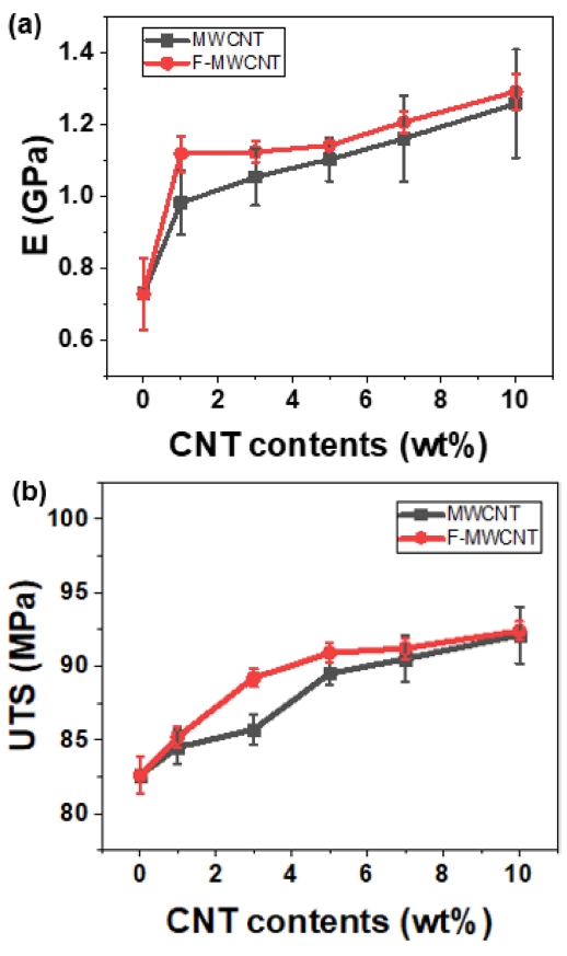 그림 5는 MWCNT와 F-MWCNT 복합체를 나노 필러 함량 별로 갖고 있는 영률(a)과 극한 인장 강도(b)를 구한 그래프이다. 나노 필러의 함량 0,1,3,5,7,10