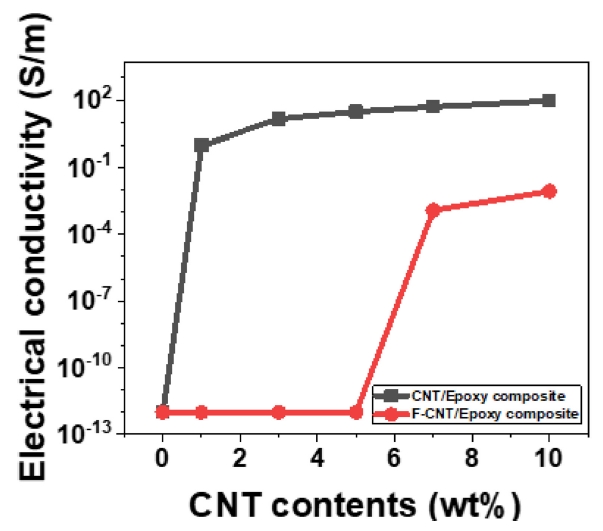 재료로 알려져 있으며, CNT를 전도성 필러로 사용하게 될 경우 함량 대비 높은 효율로 전기전도도를 갖는 복합체를 만들 수 있다는 장점이 있다 [32]. 그림 6은 일반 CNT와 F-CNT 에폭시 복합체의 전기전도도를 나타내는 그래프이다. 일반 CNT의 경우 1,3,5,7,10 wt.% 함량 5가지 경우에