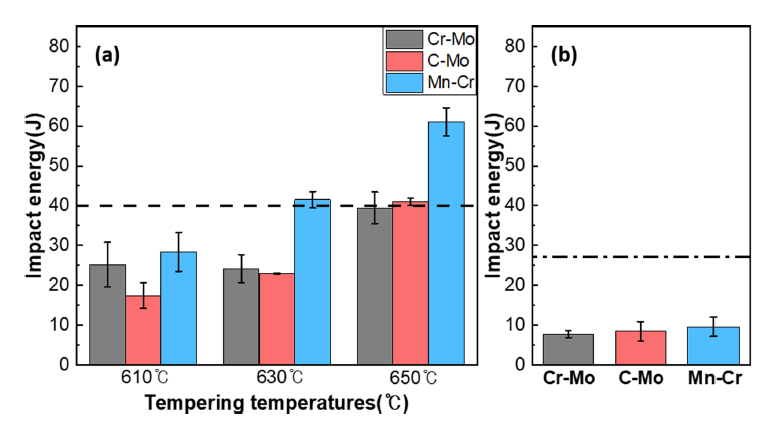 Mn-Cr 합금은 SEW520 G22NiM°Cr5-6의 충격에너지 값에 도달하였고, C-Mo, Cr-Mo 합금은 650 °C 템퍼링 조건에서 비교