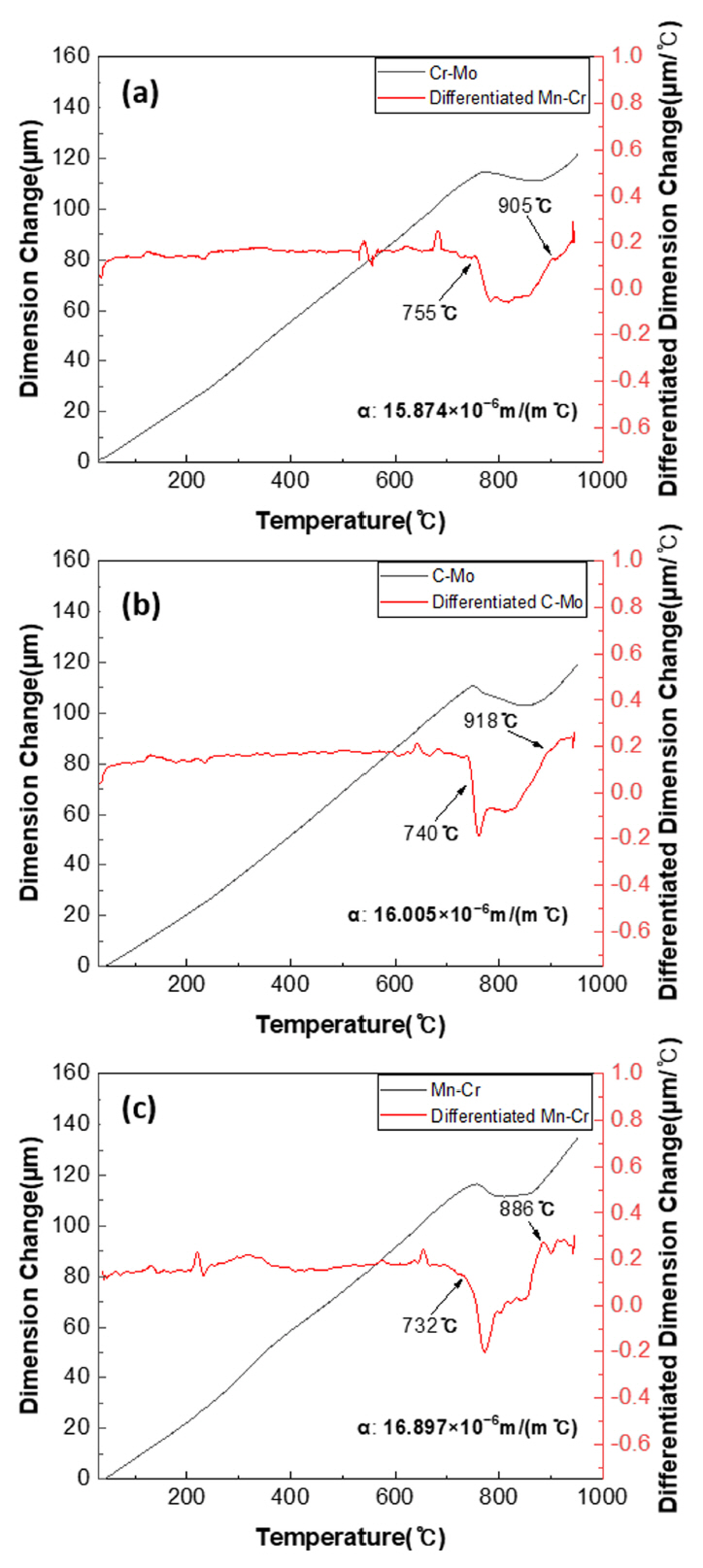 나타났다. 기지조직인 BCC 페라이트 상의 오스테나이트 상으로의 변태 온도인 Ac3 는 Mn-Cr 합금이 가장 낮았으며, Cr-Mo, C-Mo 합금은 이보다 높은 온도에서 변태가 일어났다.