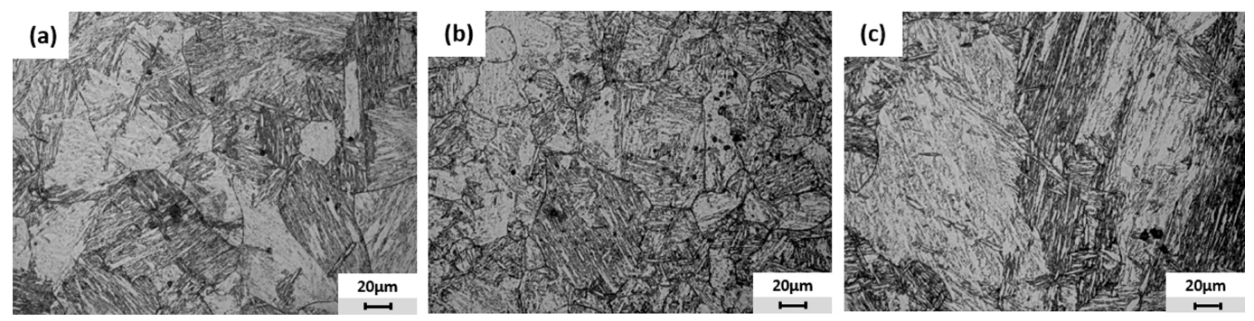 940 °C에서 1시간 유지후 퀜칭, 610 °C에서 2시간 템퍼링을 진행한 각 합금의 광학현미경 사진을 그림 4에 나타내었다. 그림 4는 피크린산 용액에 에칭된 각 합금의 광학 현미경 조직 사진이다. 오스테나이트에서 변태로 생성된 마르텐사이트 조직을 관찰할 수 있으며, 마르텐사이트