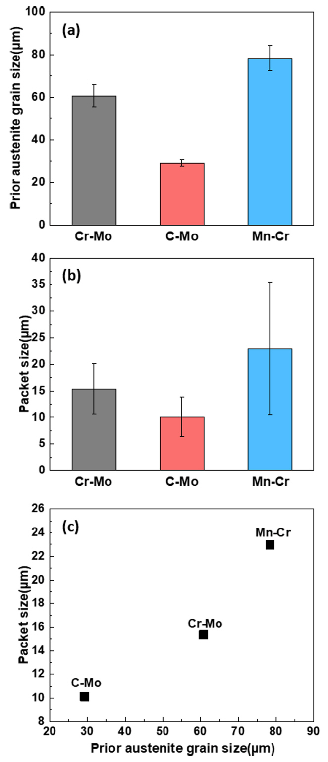 2%나이탈 용액으로 에칭하여 면적 환산법으로 측정한 패킷 크기를 그림 5에 나타내었다. 그림 5(a)의 오스테나이트 결정립(Prior Austenite Grain) 크기는 Cr-Mo 합금이 60.8 µm, C-Mo 합금 29.3 µm, Mn-Cr