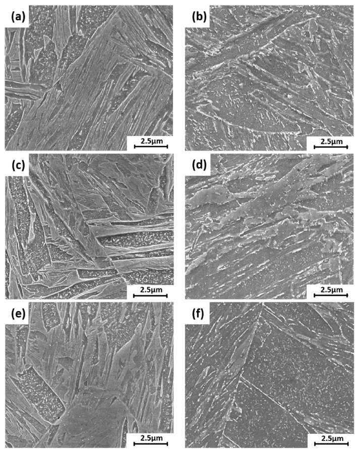 그림 6은 940°C에서 퀜칭된 시편과 610°C에서 템퍼링된 시편을 2% 나이탈 용액으로 에칭한 주사전자현미경 조직 사진이다. 그림 6(a),(c),(e) 사진은 각 합금의 퀜칭된 시편이며, 그림 6(b),(d),(f) 사진은 템퍼링후 시편의 주사전자현미경 조직 사진이다. 칭된 시편에서는 미세한 래스로 이루어진 마르텐사이트 블록과, 급냉된 마르텐사이트 블록배열 사이에