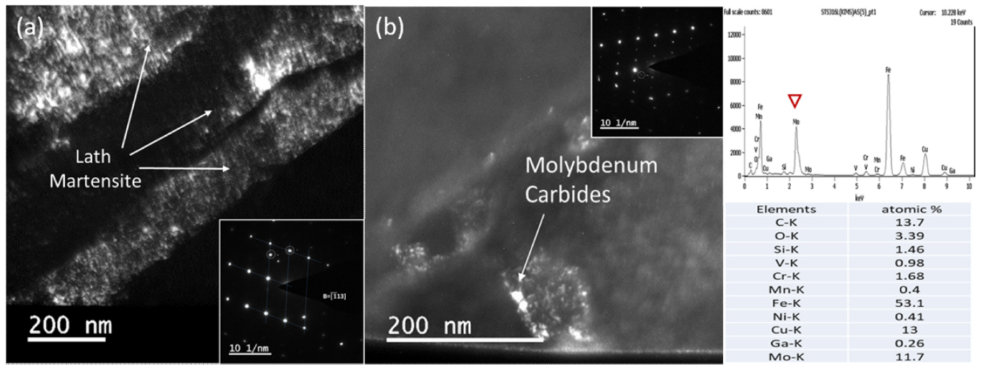 그림 7은 940°C에서 퀜칭후 610°C에서 템퍼링된 C-Mo 합금의 투과전자현미경(TEM) 미세조직 사진이다. 그림 7(a)는 급랭되어 마르텐사이트 변태로 형성된 블록 내부의 래스 마르텐사이트의 암시야상 이미지이다. 동일한 방향으로 성장하여 배열된 래스의 폭은 약 200