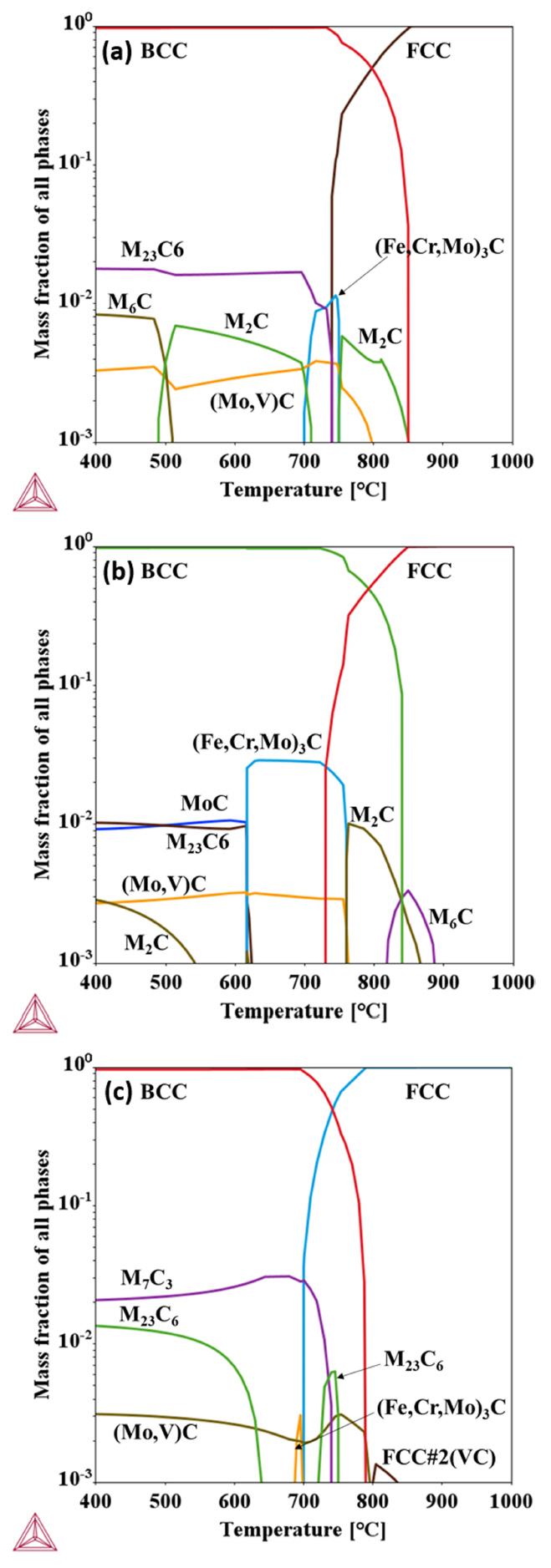 포함된 Mn-Cr 합금에서는 M7C3, M23C6, (Mo,V)C 형태의 탄화물이 안정상으로 예측되었다. 합금 모두 V 합금원소가 포함되기 때문에 (Mo,V)C 탄화물이 소량으로 존재하는 것으로