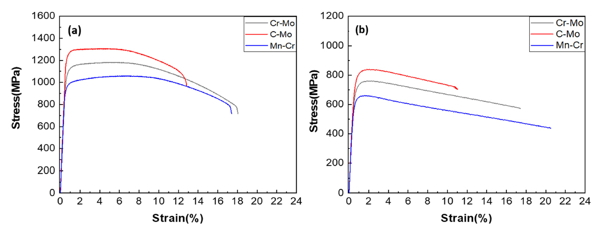 인장시험 결과값을 나타낸 것이다. 그림 9(a)는 상온 인장 응력-변형률 그래프이며, C-Mo 합금이 가장 높은 인장강도 및 항복강도를 나타내었고, Cr-Mo, Mn-Cr 합금 순으로 높은