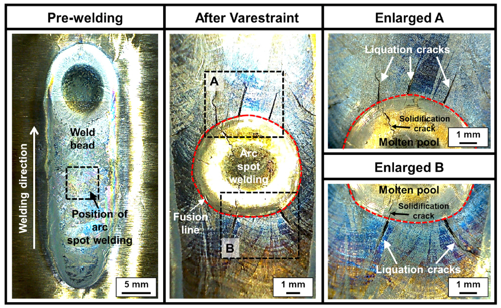 ๋น๋ ์ค์๋ถ์ ์ํฌ ์ ์ฉ์ (arc spot welding)์ ์ด์ฉํ Varestraint ์ํ์ ์ค์ํ์๋ค. ์ํ๊ณผ์ ์์ pre-welding์