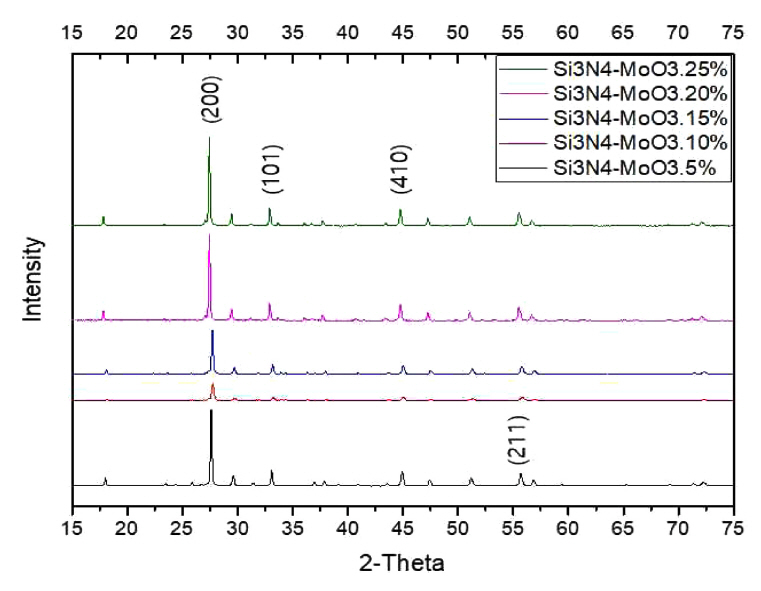 XRD(X-ray diffraction)를 사용하여 분석한 그래프이다. XRD peak를 분석한 결과 MoO3와 질화규소의 peak이 나타났고 MoO3 첨가 비율이 높아짐에 따라서 main peak이 왼쪽으로 이동되고 결정사이즈가 커진 것으로 측정되었다. 결정크기의 변화폭이 2배정도로 크게 나타났고