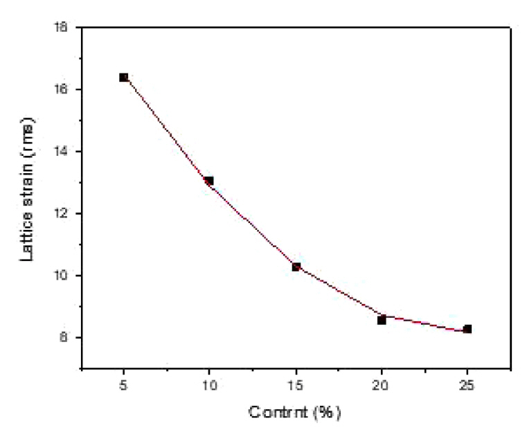 Williamson-Hall방정식을 통해 결정의 크기가 작아지면 변형률이 반비례로 증가하는 것을 확인할 수 있다.