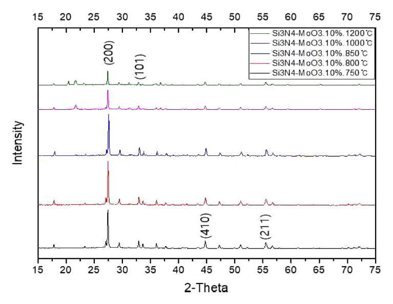 그림 8은 글라스 프릿과 질화규소 파우더의 비율을 8 : 2로 배합하고 MoO3 파우더를 10 wt%비율로 첨가한 페이스트를 750 °C, 800 °C, 850 °C, 1000 °C, 1200 °C의 온도로 소성한 샘플을 XRD(X-ray