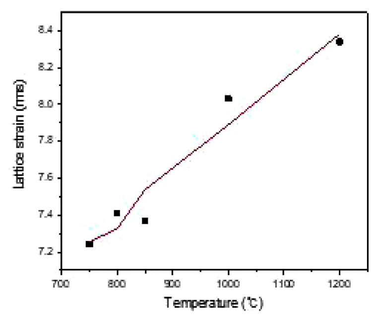소성온도에 따른 조건의 데이터는 850 °C 이상에서 경향과는 다른 큰 격자 변형률과 작은 결정크기가 나타났고 이런 경향의 이유는 입자간의 결합에서