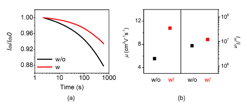 소자는 표면처리를 진행하지 않은 소자 보다 더 긴 τ(6.004×102 s)를 가지며, 이 값은 측정하는 시간에 따라 더 커질 수 있다. 인가되는 전기적 스트레스에 따른 Ids 값의 감소는 반도체 활성층과 절연층 계면의 전하 캐리어의 트래핑과 관련이 있다. 지속적으로 인가되는 스트레스 전압에 의해 절연층 내부 트랩이 형성되며,