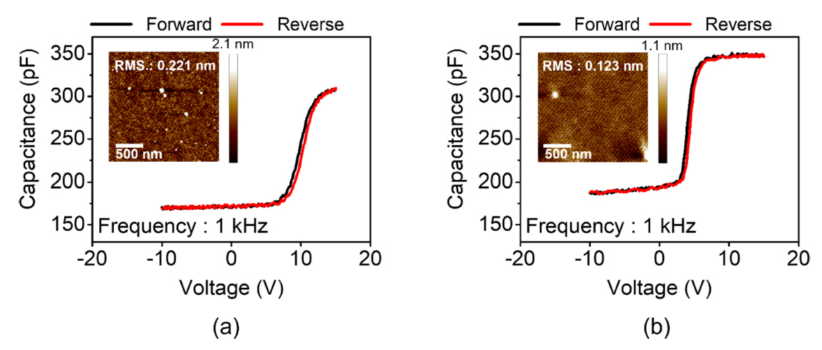 a-IGZO 활성층과 SiO2 절연층 계면 트랩된 전하의 정도를 확인하기 위해 capacitance-voltage (C-V) curve를 측정하여 결과를 그림 5에 나타내었다. C-V curve 측정을 위해 a-IGZO TFT 소자의 bottom gate 전극에 -10~15 V 까지 0.5 step voltage로