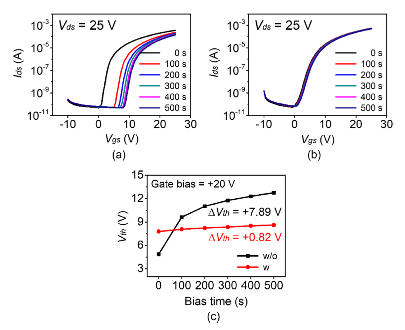 경우 bias voltage가 500초 이상 인가되어도 Vth 값은 -0.30 V 이동하였다. 전압이 인가되는 시간에 따른 두 소자의 Vth 값의 변화량은 그림 7(c)에 정리하였다.