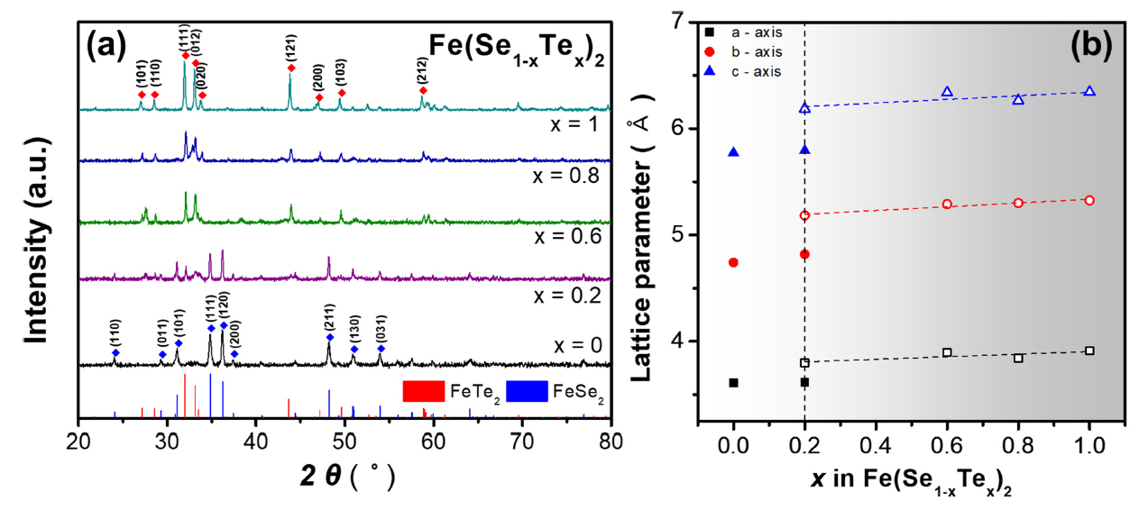 (a) XRD patterns and (b) calculated lattice parameters a, b and c of Fe(Se1-xTex)2 (x = 0, 0.2, 0.6, 0.8 and 1). Solid and open symbols in (b) correspond to lattice parameters