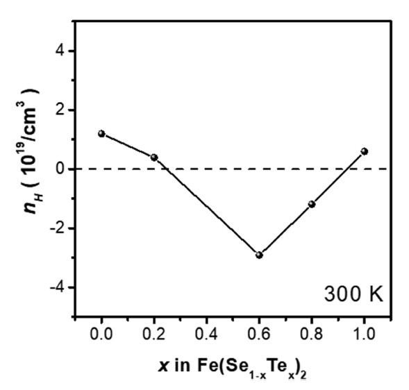 (a) Hall carrier concentration nH as a function of x in Fe(Se1-xTex)2 (x = 0, 0.2, 0.6, 0.8 and 1) at 300K.
