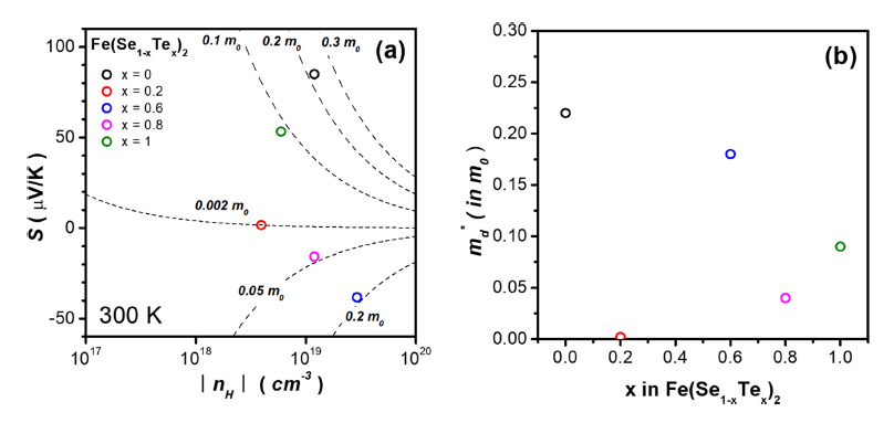 (a) Pisarenko plot S-|nH|, (b) effective mass m* as a function of x of Fe(Se1-x, Tex)2 (x = 0, 0.2, 0.6, 0.8 and 1) at 300K (m0 = free electron mass).