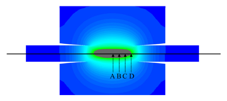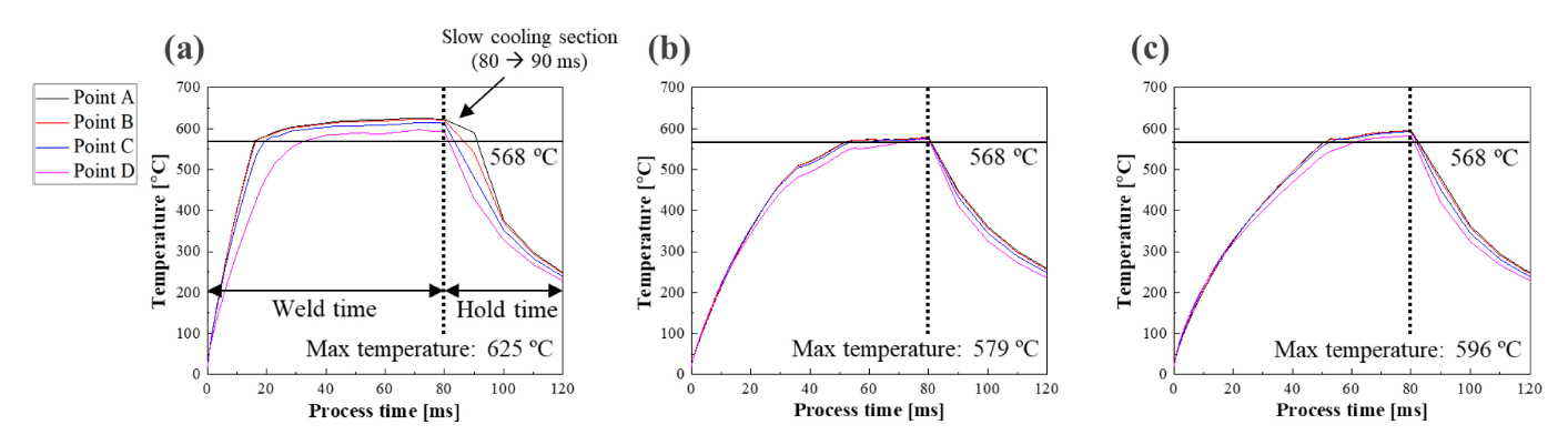 35 kA, type 3의 용접전류는 30 kA 로 설정하였고, 접합면의 중심(A)에서부터 가장자리(D)까지 동일한 거리로 나누어 분석하였다. 예비시간과