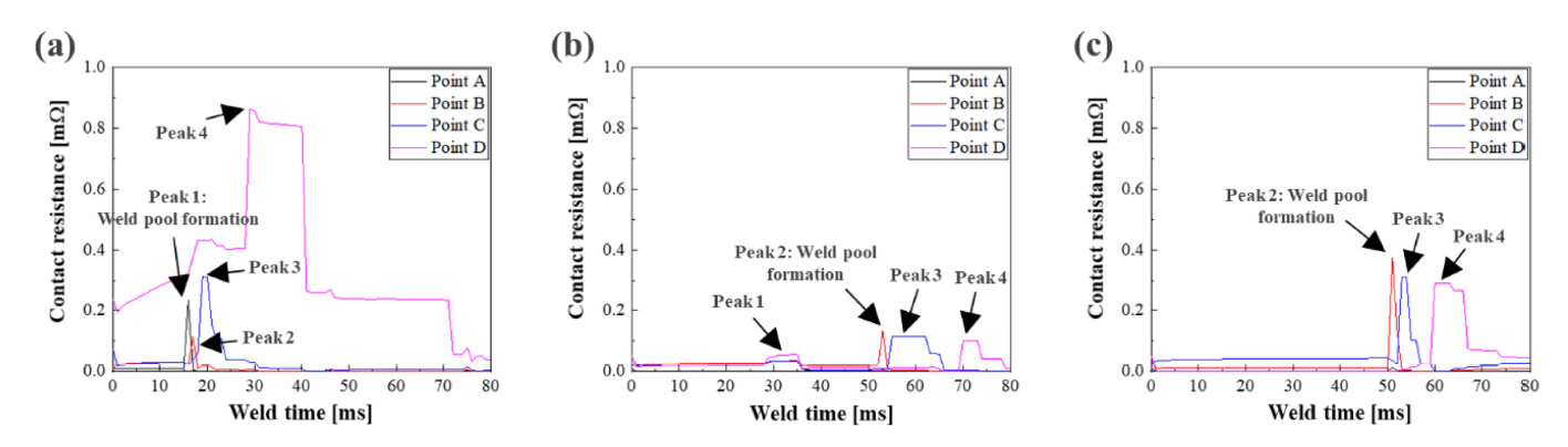 크기, 피크의 발생 시점에 차이가 존재하였다. 그림 3(a)의 피크 1-4의 경우 통전 초기에 집중되어 있고, 그림 3(b)과 그림 3(c)의 피크는 50 ms 에서 70 ms 까지 분포하였다. 초기 용접시간 동안 접촉저항은 그림 3(a), 그림 3(c), 그림 3(b) 순으로 나타났다. 이러한 현상들은 예비시간의 높은 가압력을 적용한 조건의 접촉저항(그림 3(b)와 그림 3(c))과 적용하지 않은 접촉저항(그림 3(a))을 비교할 경우, 예비시간 동안의 높은 가압력을 적용함에 따른 결과로 판단되나, 가압력 제어에 따른 효과를 피크의 형태와 접촉 저항만을 통해 규명하기엔