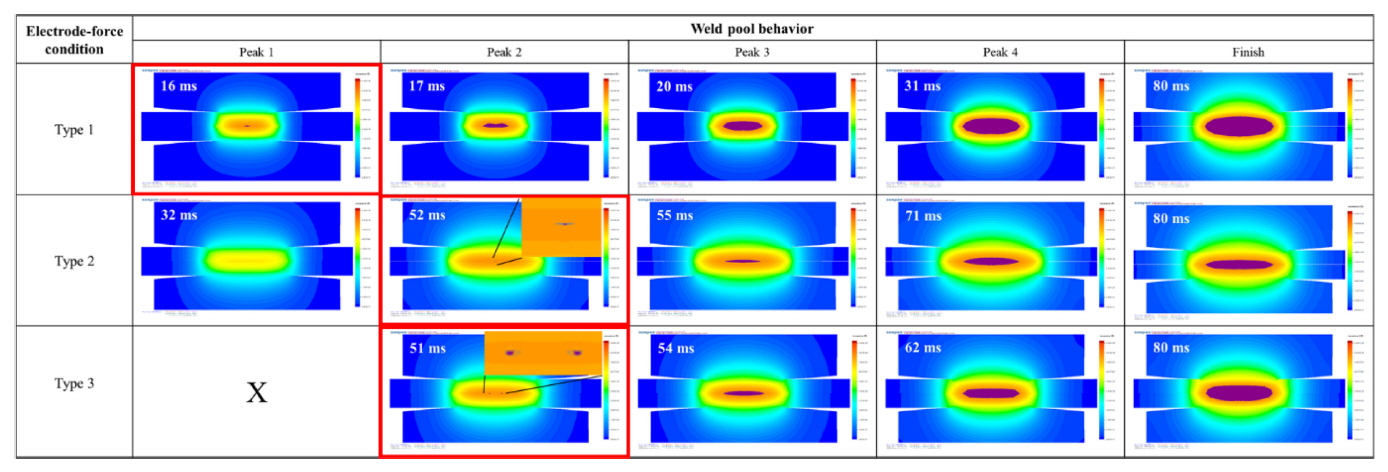 용접시간, 유지시간은 실제 용접조건과 동일하게 설정하였고, 예비시간과 용접시간의 전극의 가압력에 따라 3가지 유형으로 분류하였다 (표 2).