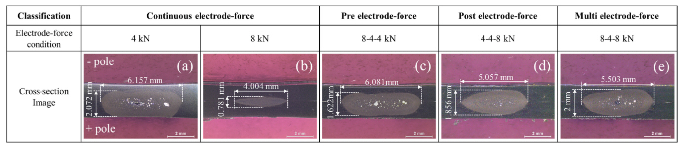 때문이다 [28]. 전체 공정 동안 연속적으로 가압력 4 kN 을 적용할 경우, 판재와 전극의 부착되는 현상인 융착(sticking)이 발생하였으나, 예비시간 동안
