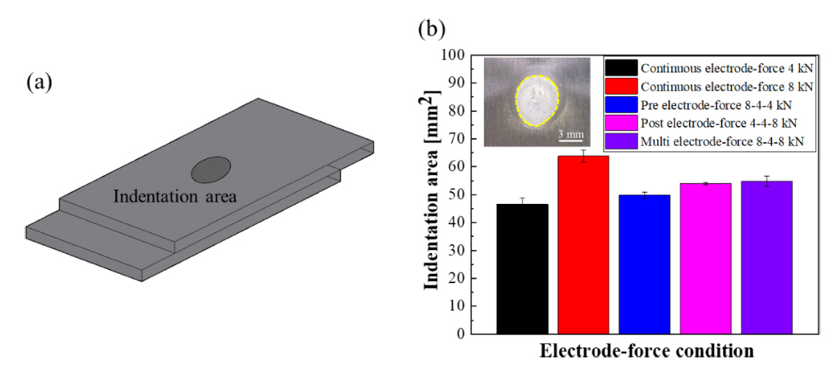 Comparison of indentation area by electrode-force control types after weld time: (a)