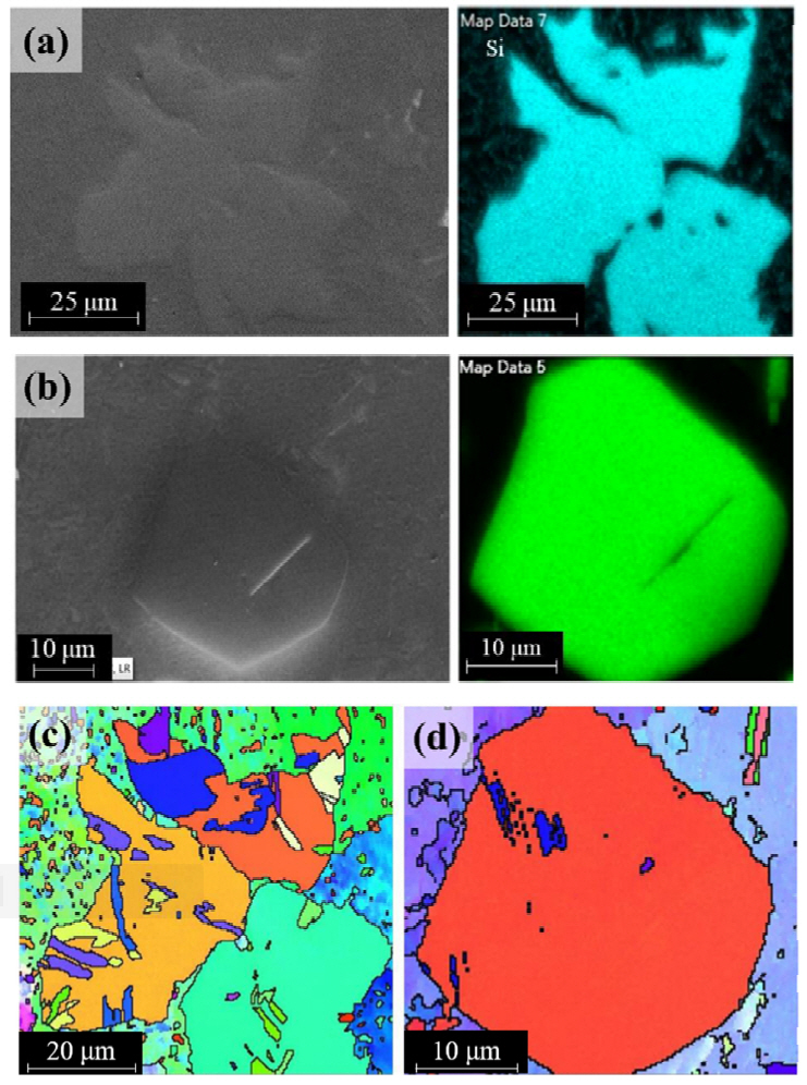 (그림 1(b)). 두 주조재들의 EBSD 분석 결과(그림 1(c), (d)), DC 주조재는 primary Si 내부에 여러 결정 방위의 multi-fold branched orientation (MFBO)를 나타냈다.