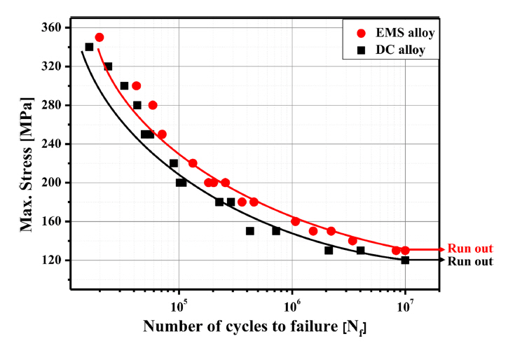 High-cycle fatigue properties of extruded hypereutectic AlSi alloys (DC, EMS alloy).