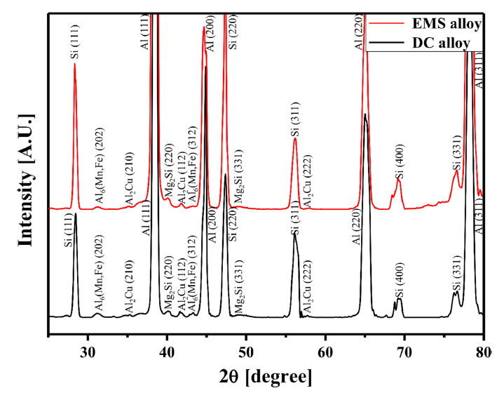 XRD analysis results of extruded hypereutectic Al-Si alloys (DC, EMS alloys).