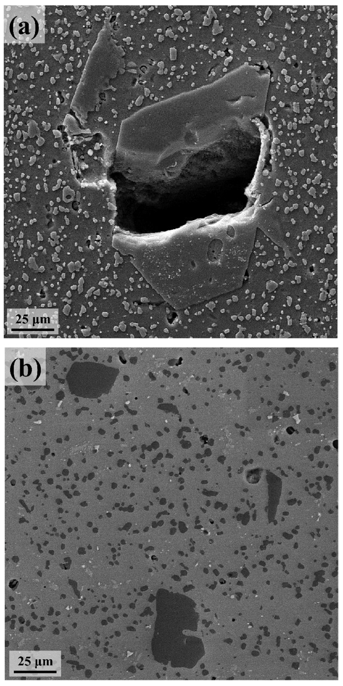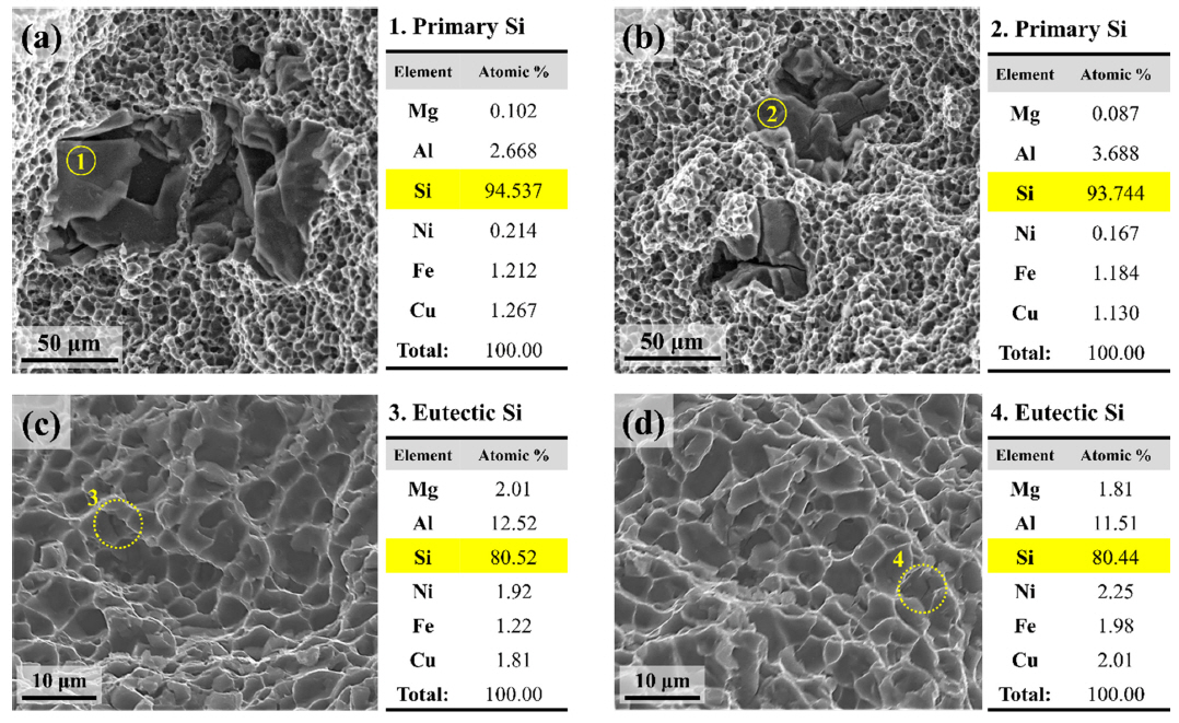이에 따라 primary Si 상 내부에 파괴가 나타난 것으로 예상된다. 그러나 SEM 관찰 결과에서 미세한 30~40 μm 크기의 primary