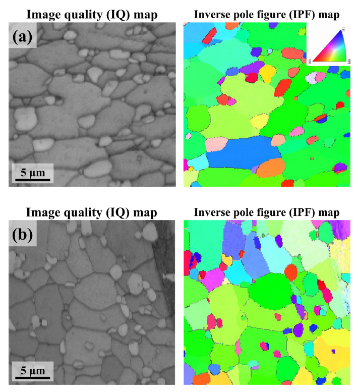 grain sizes (AGSs))을 알아보기 위해 EBSD (image quality (IQ) & inverse pole figure (IPF)