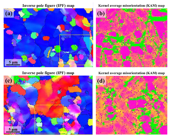 map), (c) EMS alloy (IPF map) and (d) EMS alloy (KAM map).