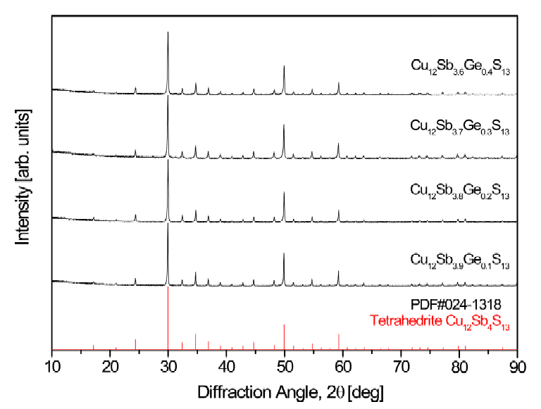 [15]. In this study, Cu12Sb4-yGeyS13 (y = 0.1–0.4), partially substituted with Ge at the Sb sites, were synthesized by MA