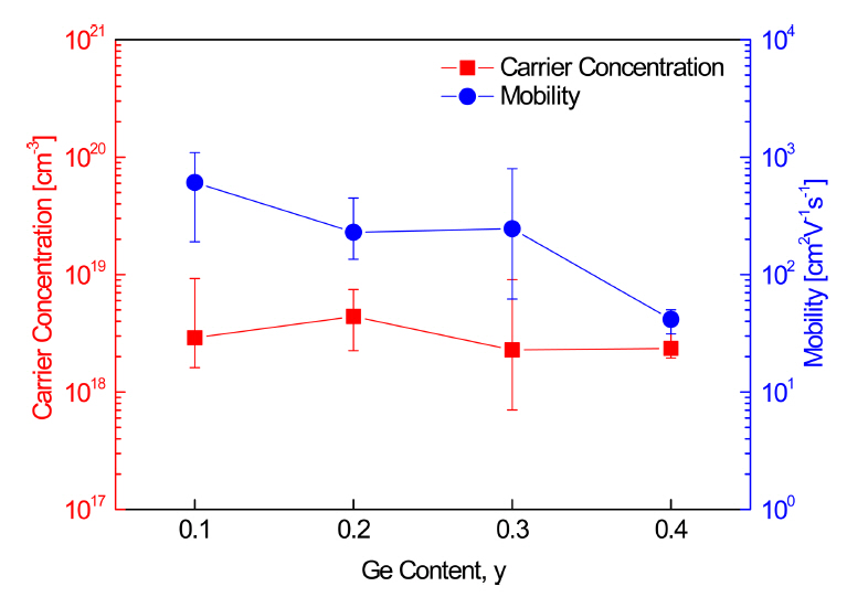 large, and the mobility decreased as the Ge content increased. When the Hall coefficient