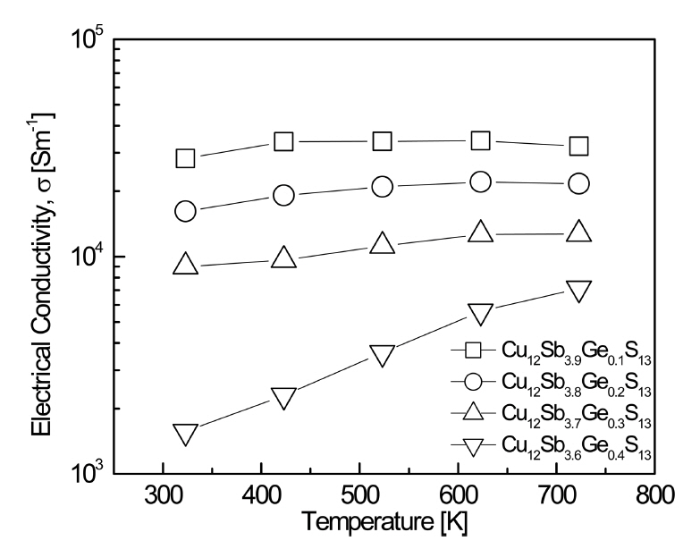 to additional electrons with the Ge4+ substitutions at the Sb3+ sites. In this study, Cu12Sb3.9Ge0.1S13 exhibited the highest electrical conductivity of (2.8–3.2) × 104 Sm-1 at 323–723 K. Barbier et al. [4] reported an electrical conductivity of (4.3−6.2) × 104 Sm-1 at 300–690 K for the undoped Cu12Sb4S13. Kwak et al. [10] suggested that, as the Bi content of Cu12Sb4-yBiyS13 (y = 0.1–0.4) increased, more Cu vacancies acting as acceptors resulted in the carrier