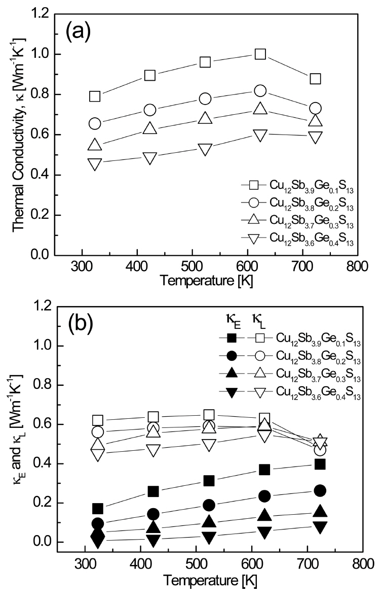 Figure 7 (a) shows the thermal conductivity of Cu12Sb4-yGeyS13. The thermal conductivity initially increased with the temperature, and then decreased
