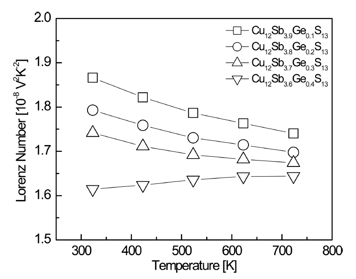which reflects the behavior of a nondegenerate semiconductor. Cu12Sb3.6Ge0.4S13 exhibited the lowest value of (1.61–1.64) × 10-8 V2K-2 at 323–723 K. Pi et al. [23] reported higher values of (1.76–1.69) × 10-8 V2K-2 at 323–723 K for an undoped Cu12Sb4S13.